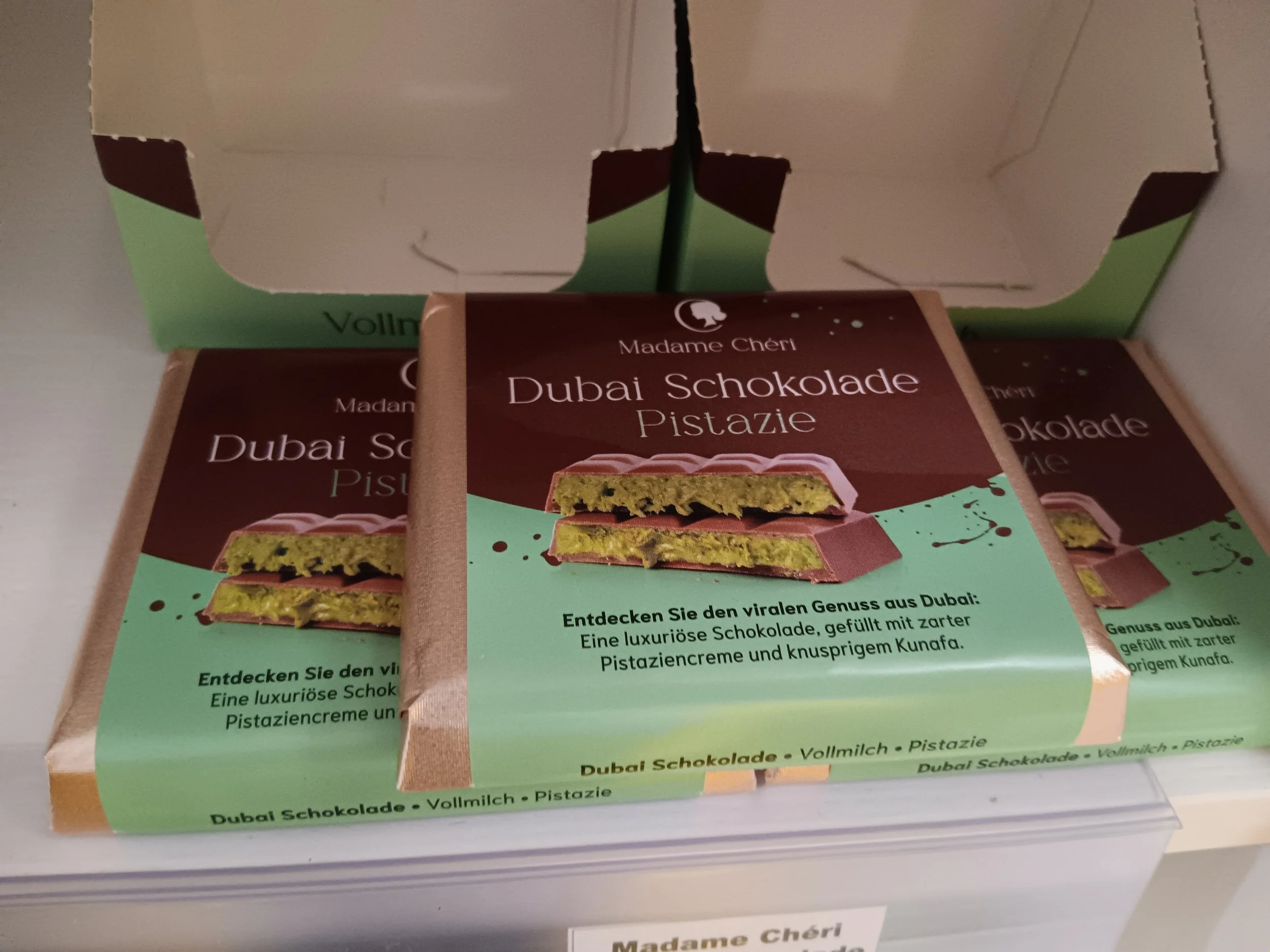 Neu im Sortiment: die Hype-Schokolade aus Dubai. Die beliebteste Sorte (Pistazie, Engelshaar, Sesam) gibt es hier ebenfalls.
